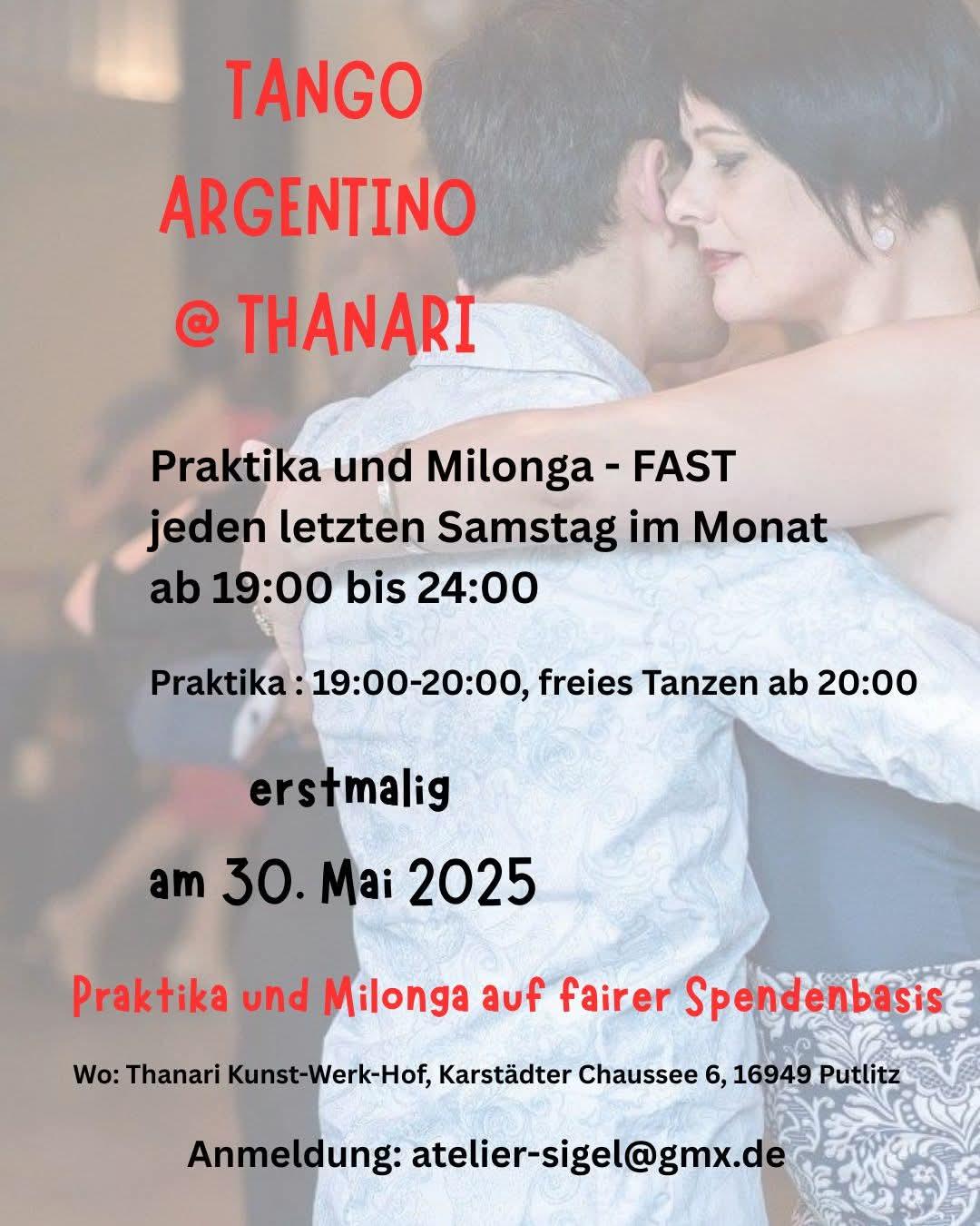 30. Mai 2025 @ 19:00 - 23:00 - Praktika und Milonga FAST jeden letzten Samstag im Monat 19:00-20:00 Praktika ab 20:00 freies Tanzen Anmeldung: info@thanari.de oder 01772732740