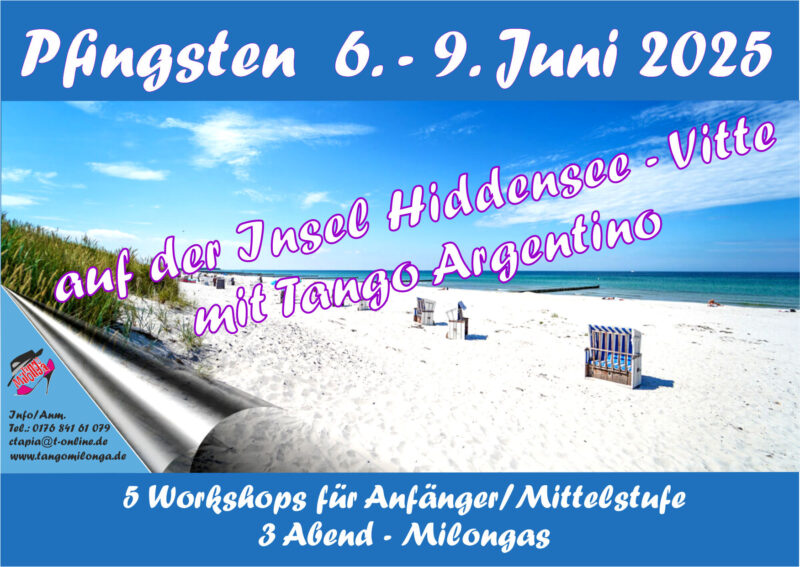 6. Juni 2025 - 9. Juni 2025 @ Ganztägig - Mit diesem Workshop setzen wir, Brigitte Backhaus und Carlos Tapia, unsere Tango-Aktivitäten auf der schönen Insel Hiddensee fort. In der Zeit der Pandemie fielen viele Arten des gemeinsamen Tanzens aus, wir freuen uns sehr, zurückzukommen und ein langes Pfingst-Wochenende gemeinsames Erleben auf dieser herrlichen Insel anbieten zu können, miteinander eine ruhige Zeit des Innehaltens zu [...]