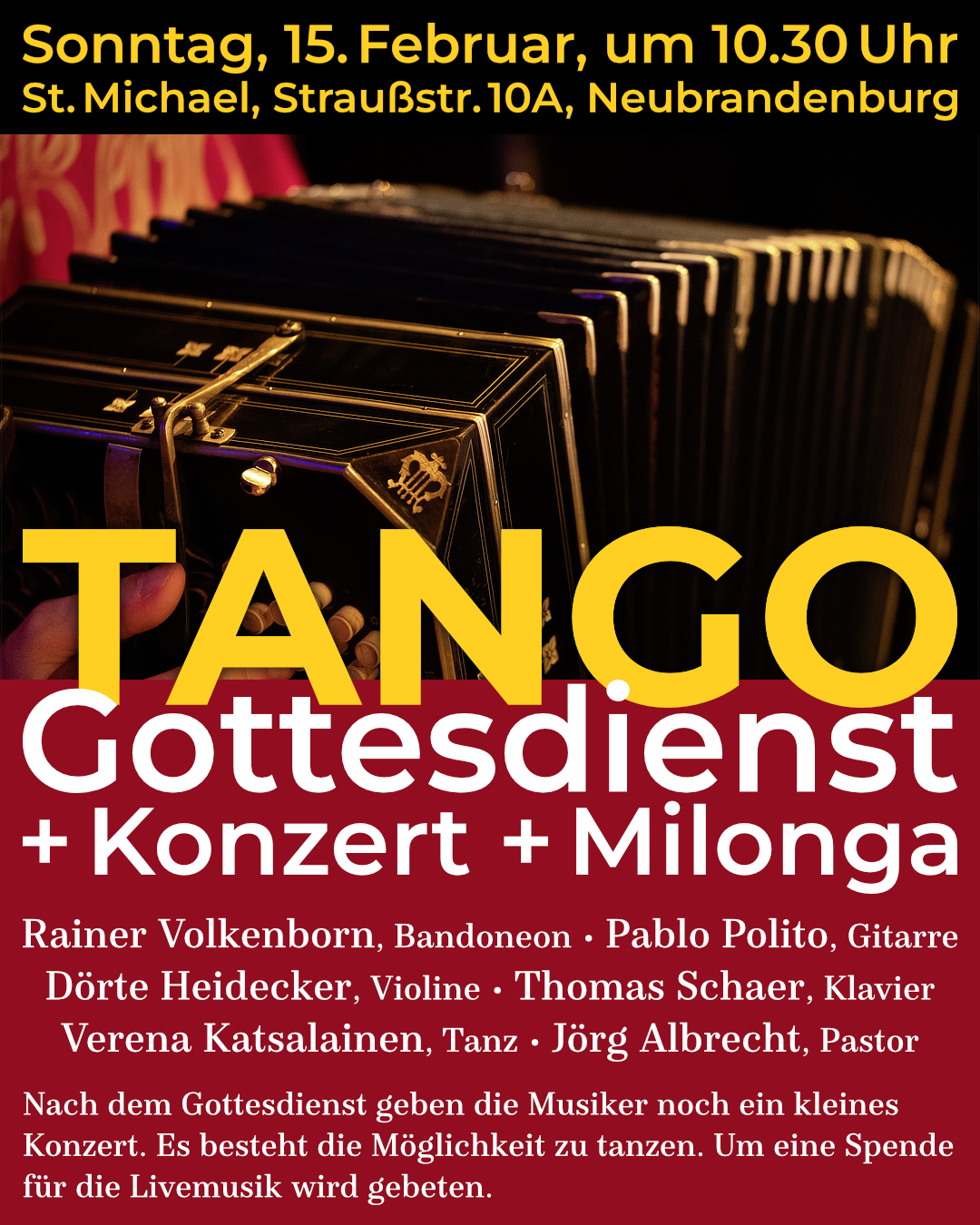 15. Februar 2026 @ 10:30 - 13:30 - Rainer Volkenborn, Bandoneon Pablo Polito, Gitarre Dörte Heidecker, Violine Thomas Schaer, Klavier Verena Katsalainen, Tanz Jörg Albrecht, Pastor Nach dem Gottesdienst geben die Musiker noch eine kleines Konzert. Es besteht die Möglichkeit zu tanzen. Um eine Spende für die Livemusik wird gebeten.