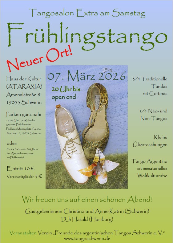 7. März 2026 @ 20:00 - 23:00 - Die “Freunde des Argentinischen Tangos e.V.” organisieren 1 x im Monat den SALON EXTRA. Mehr Infos unter https://www.tangoschwerin.de/